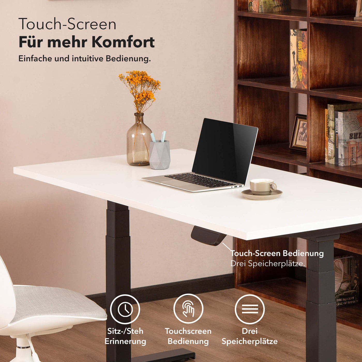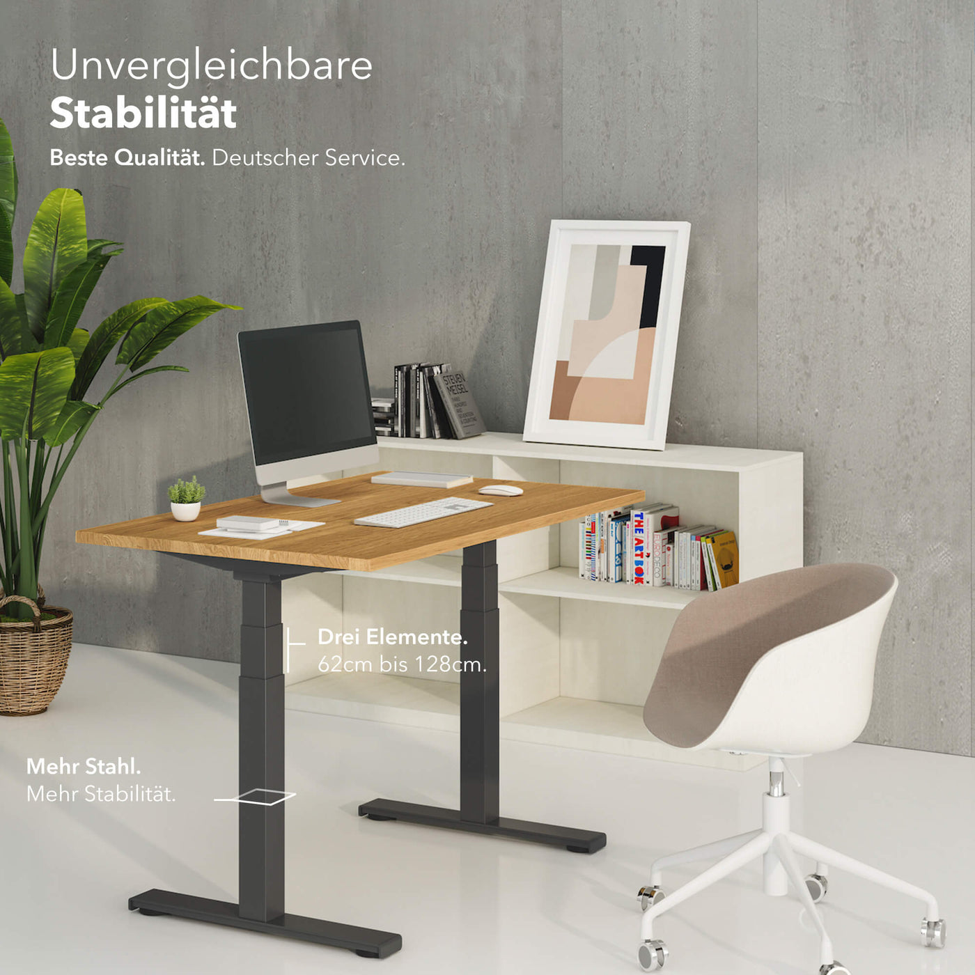 - Lieferumfang: Tischgestell mit zwei starken Motoren und Steuerungseinheit, digitales Bedienpanel, Kabelführungsleiste, Bedienungsanleitung (deutsch), Schrauben, Kabelclips